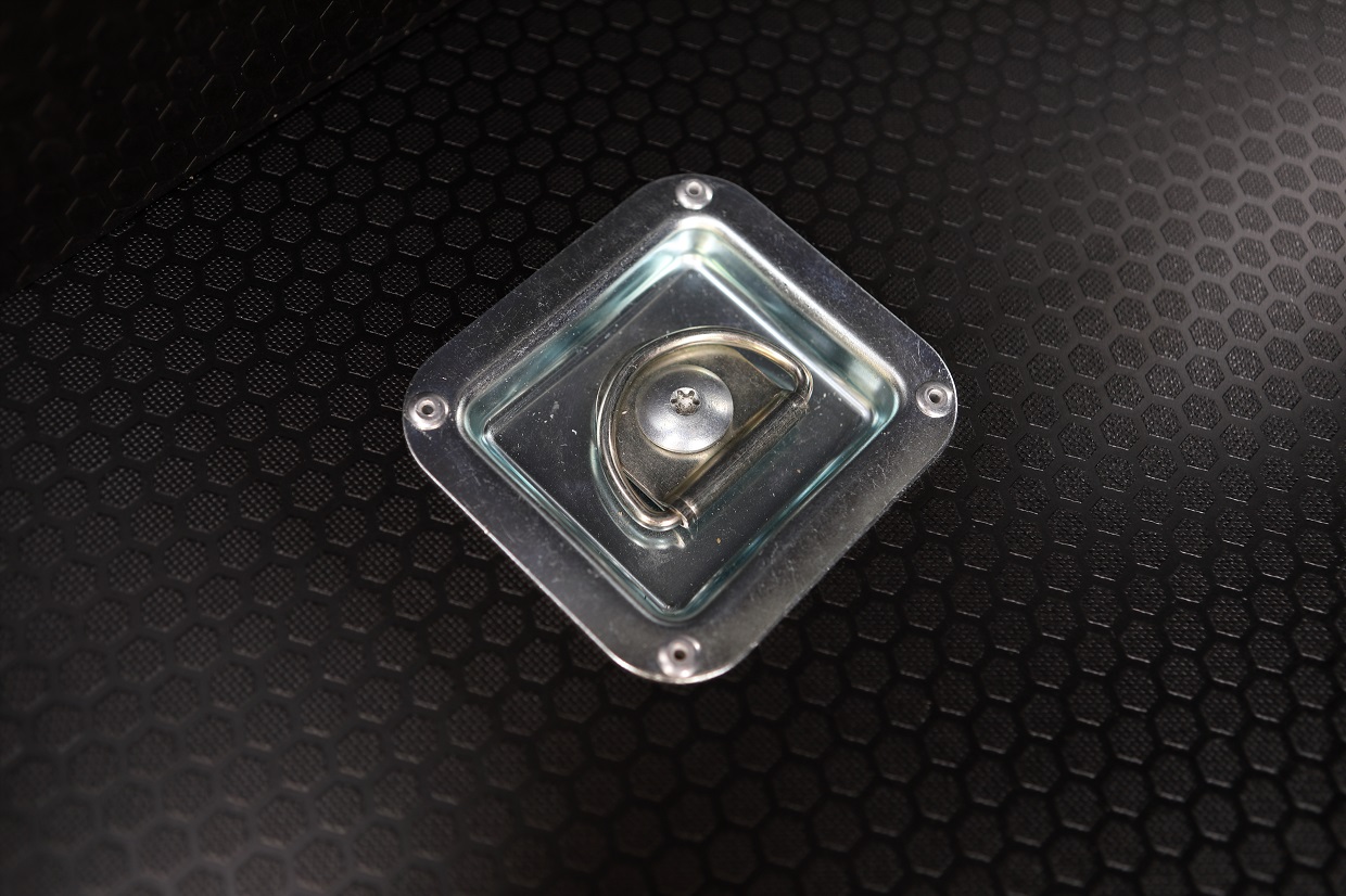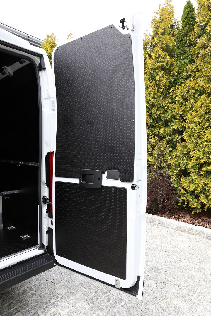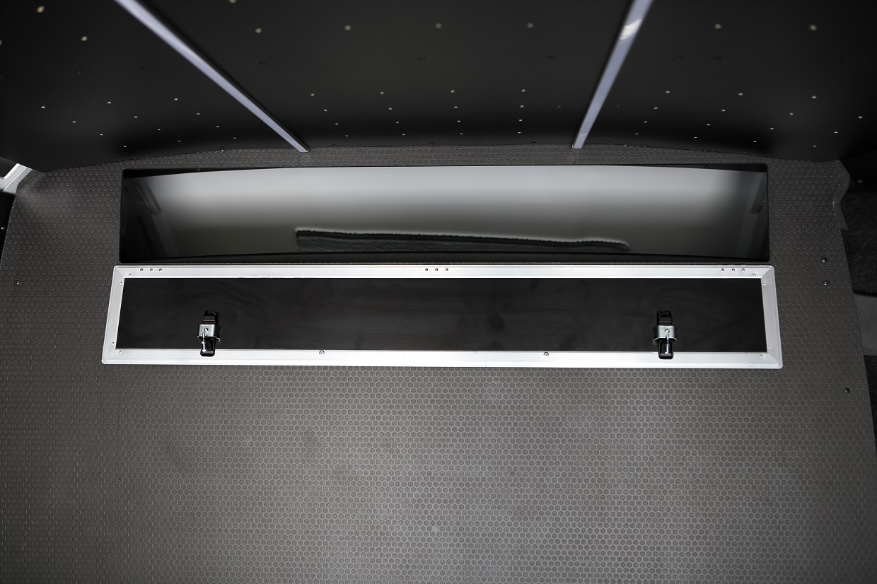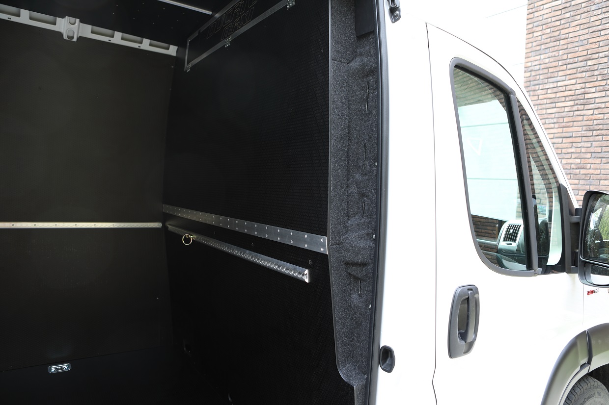 The floor, walls, rear and side doors as well as the wheel arches have been fitted with waterproof, non-slip Hexa Grip plywood. The side posts were covered with felt nonwoven. The ceiling was built-in with phenol waterproof plywood and LED strips were installed. A storage space was created in the bulkhead wall. Aluminum anchor strips with hooks were mounted on all walls.