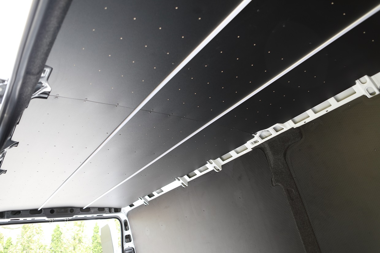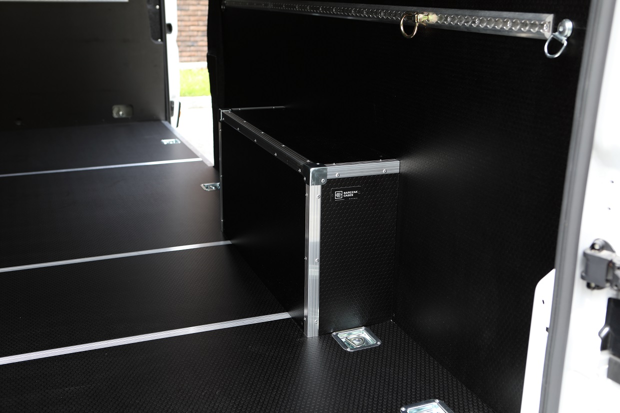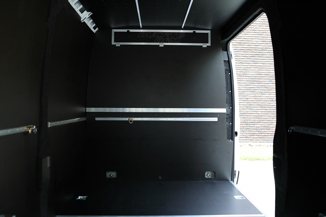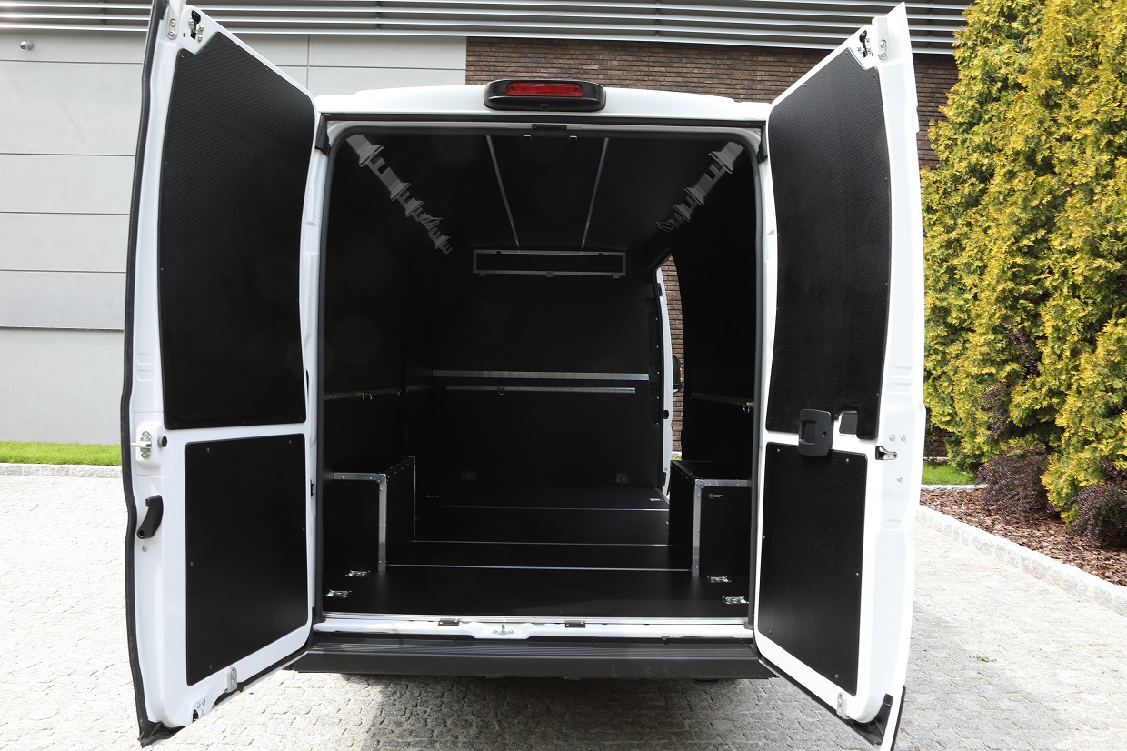 Podłoga, ściany, drzwi tylnie i boczne oraz nadkola zostały zabudowane wodoodporną, antypoślizgową sklejką Hexa Grip. Boczne słupki zostały pokryte włókniną typu filc. Natomiast sufit został zabudowany sklejką wodoodporną fenol oraz zostały zamontowane listwy LED. W ścianie grodziowej został utworzony schowek. Na wszystkich ścianach zostały zamontowane aluminiowe listwy kotwicze wraz z zaczepami.